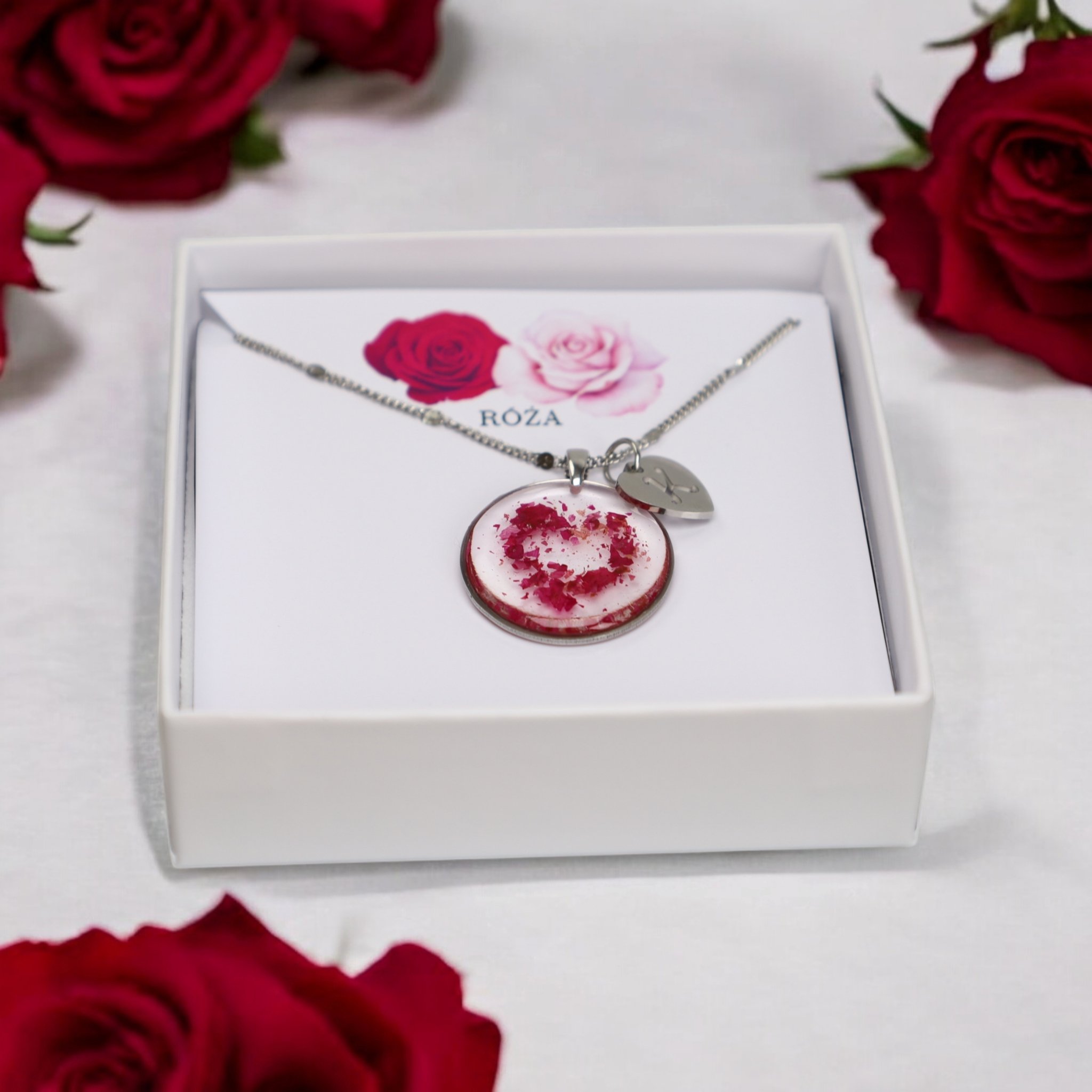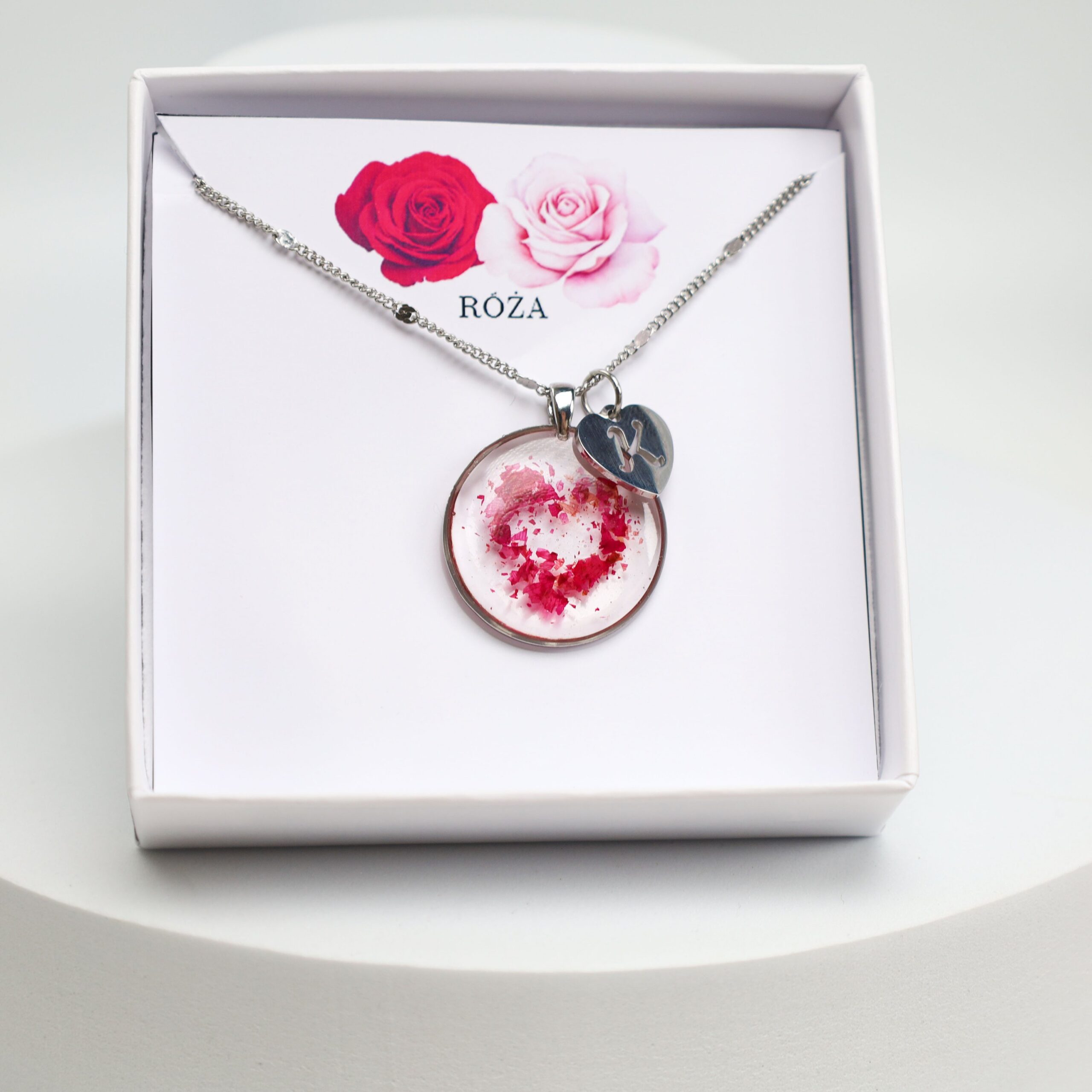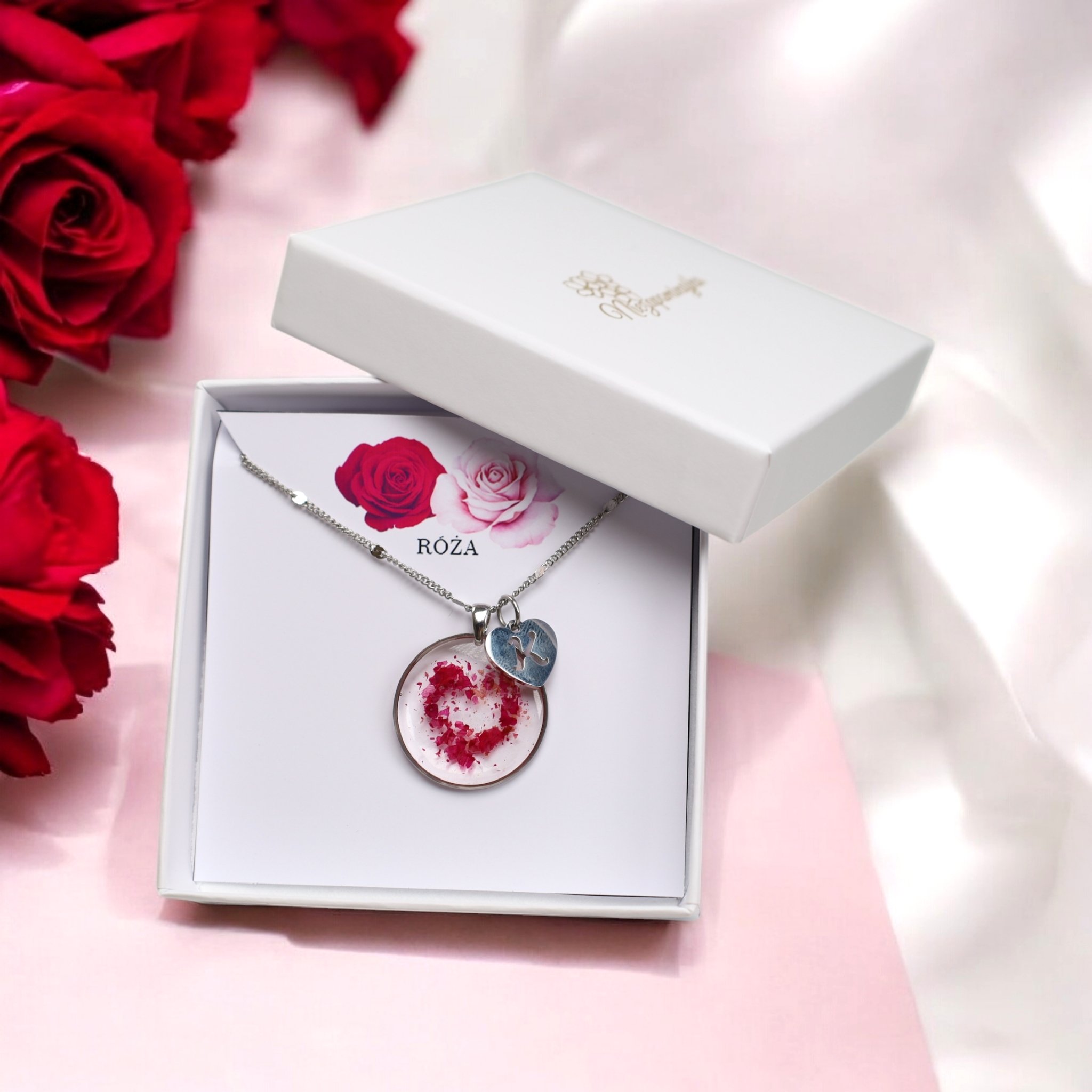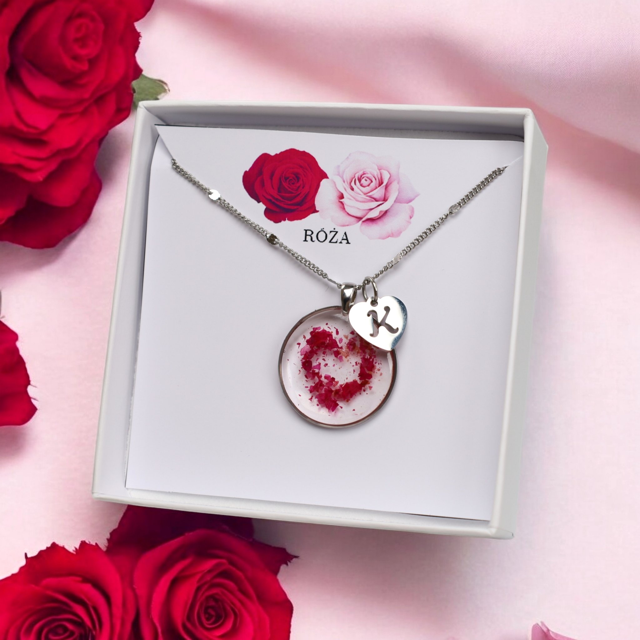 Zachwycający naszyjnik, który z pewnością przyciągnie spojrzenia i wzbudzi zachwyt. Naszyjnik wykonany z najwyższej jakości materiałów, ozdobiony płatkami róży, starannie ułożonymi w kształt serca. Każdy naszyjnik jest unikatowy. Skorzystaj z opcji personalizacji i wybierz dowolną literę co doda osobistego charakteru.