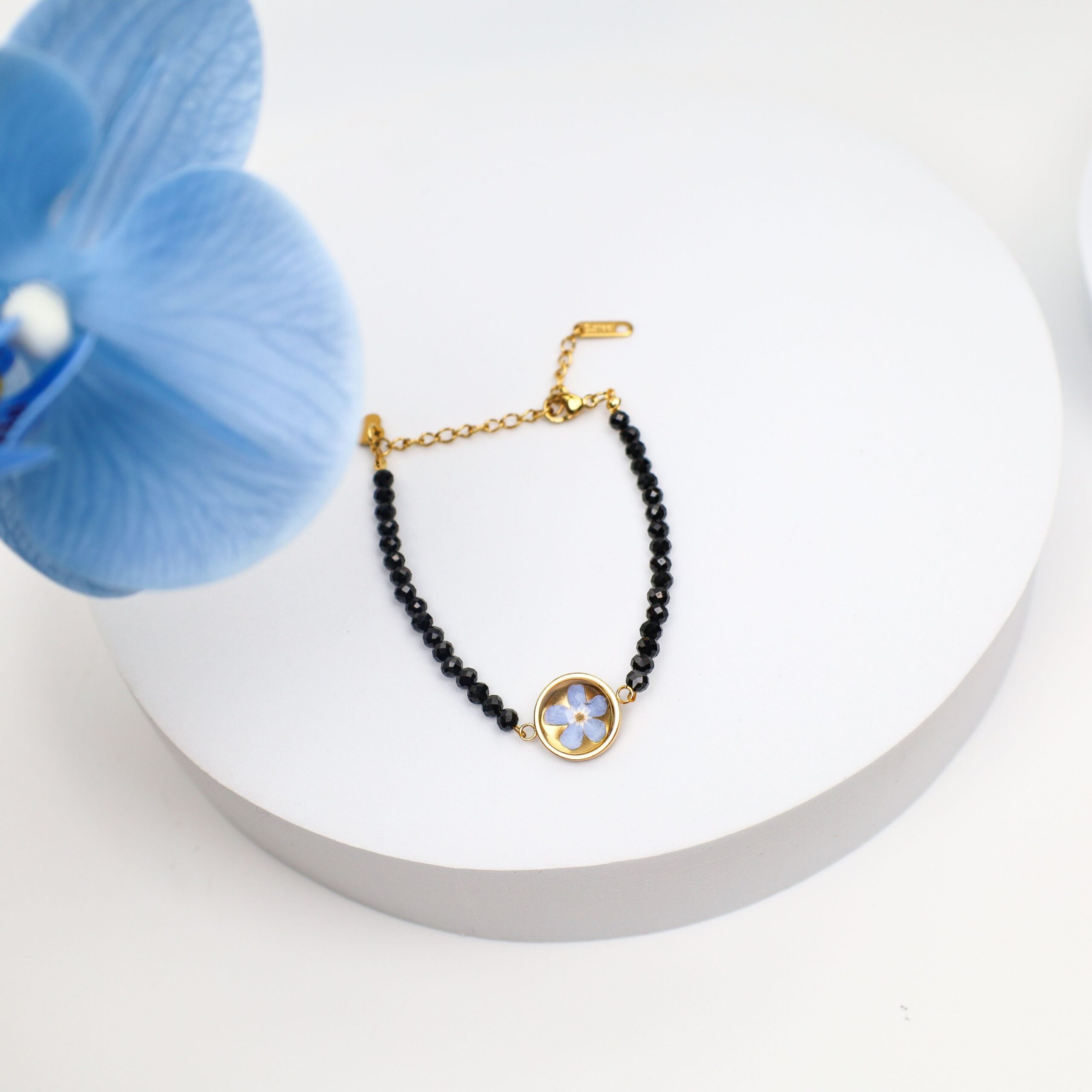 BRANSOLETKA Z KWIATAMI NIEZAPOMINAJKI ŁAŃCUSZEKBRANSOLETKA Z KWIATAMI NIEZAPOMINAJKI ŁAŃCUSZEK