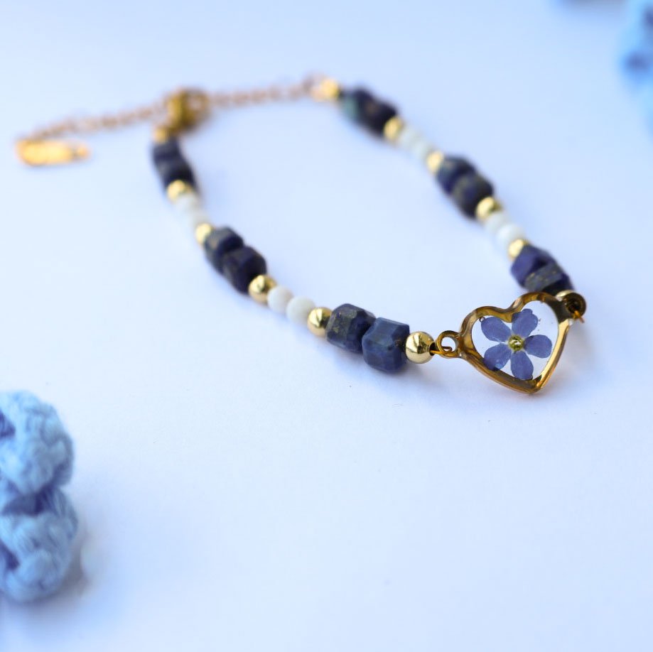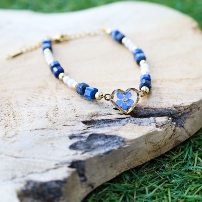 Unikatowa ręcznie robiona bransoletka z kwiatem Niezapominajki z kamieniem Księżycowym i Lapisem Lazuli.