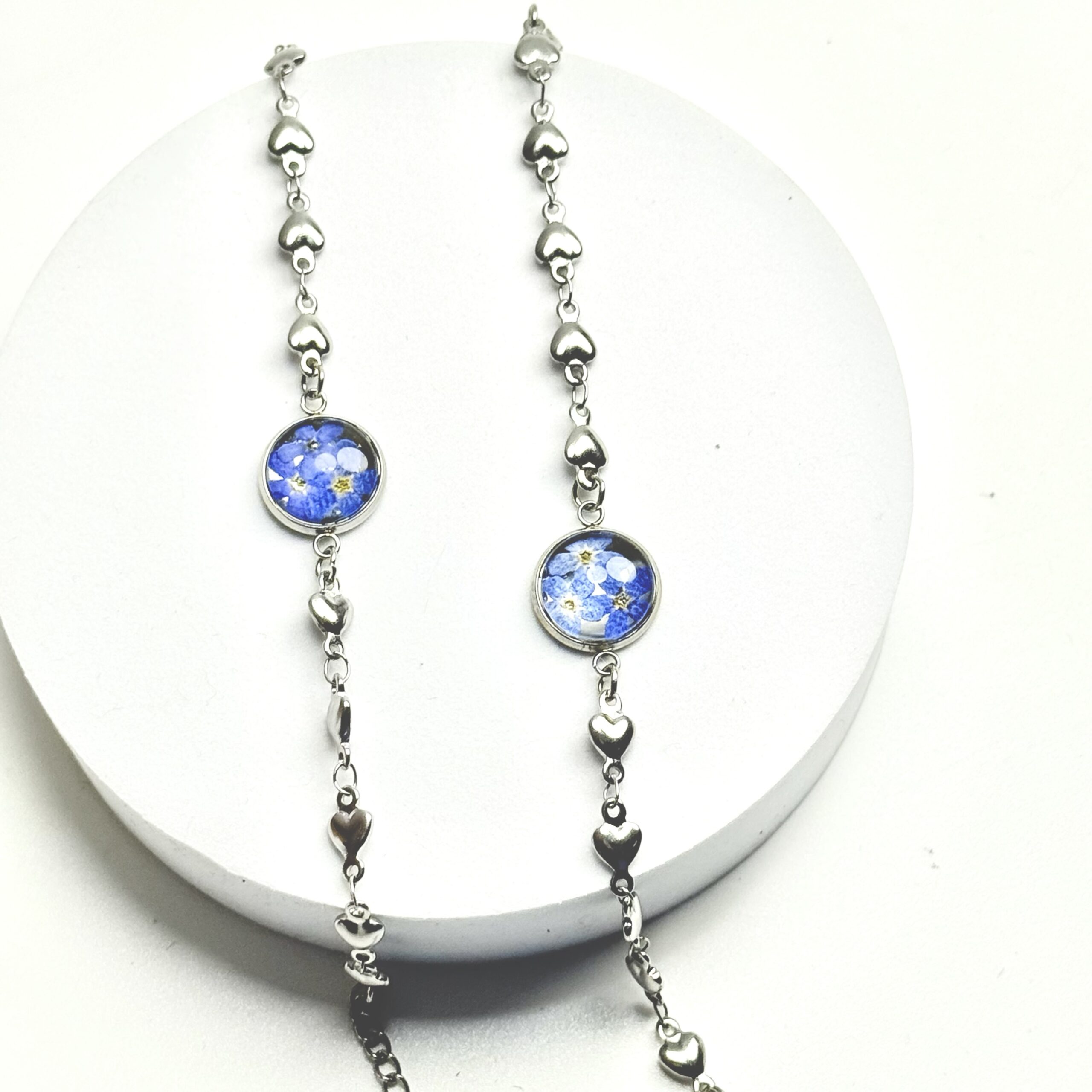 Ręcznie robiona bransoletka z kwiatami Niezapominajki! Bransoletka składa się z pięknych modułów w kształcie serca, które są ozdobione uroczymi kwiatami Niezapominajki. Moduły zostały wykonane z dbałością o każdy szczegół, a całość łączy się w harmonijną kompozycję, która z pewnością przyciągnie uwagę każdej kobiety.W naszym szklanym krysztale zostały zatopione kwiaty Niezapominajki poddane wcześniejszemu suszeniu. Dzięki temu zachowają one swoją piękną barwę oraz formę przez długie lata.