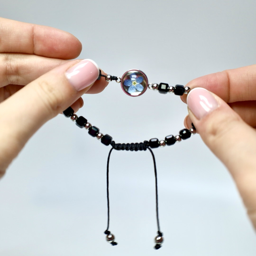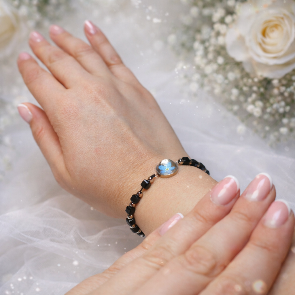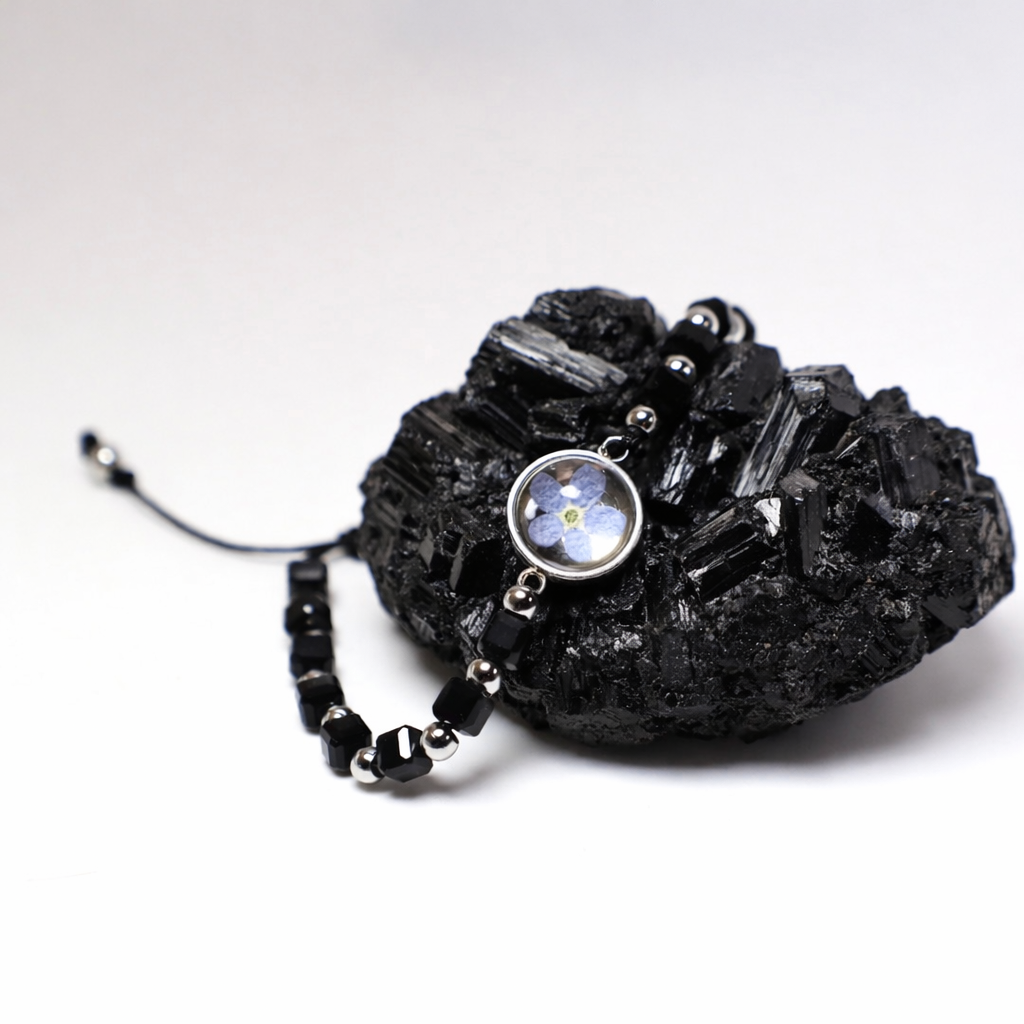 Delikatna bransoletka z czarnym turmalinem i hematytem z prawdziwą niezapominajką zatopioną w bazie. To wyjątkowa biżuteria z naturalnych kamieni i prawdziwych kwiatów, która łączy elegancję z głęboką symboliką. Czarny turmalin kojarzony jest z ochroną, hematyt ze stabilnością i siłą, a niezapominajka symbolizuje pamięć, bliskość i piękne wspomnienia. Idealna na prezent lub jako osobisty talizman na co dzień.