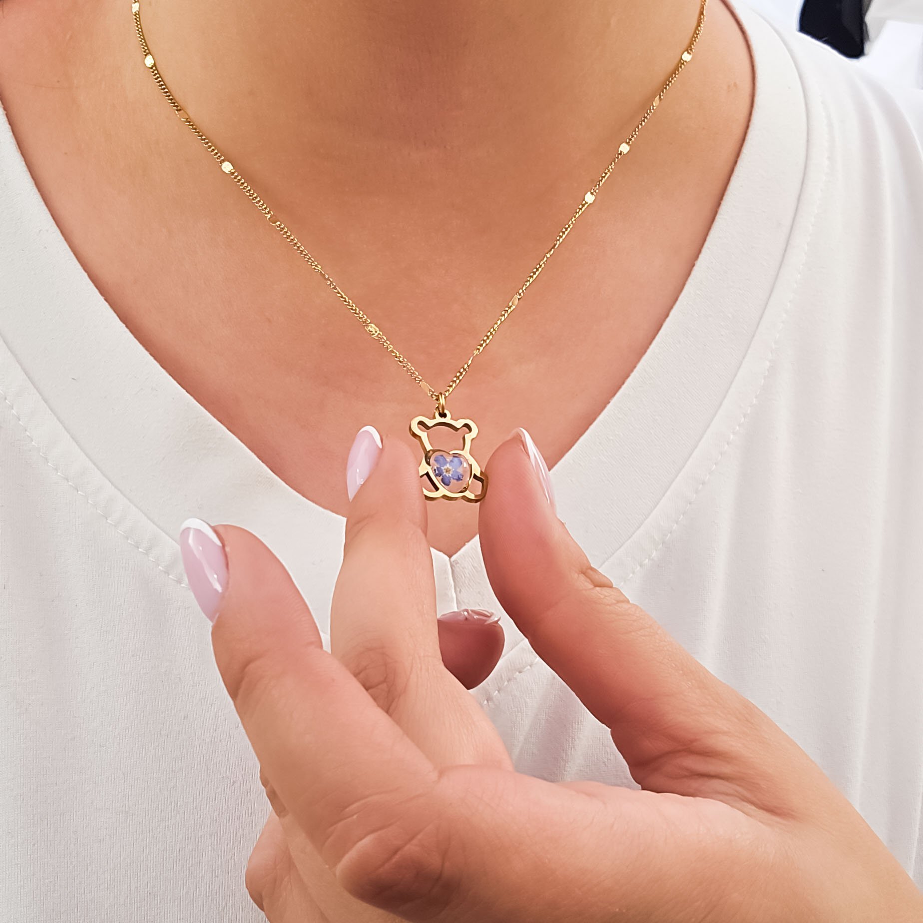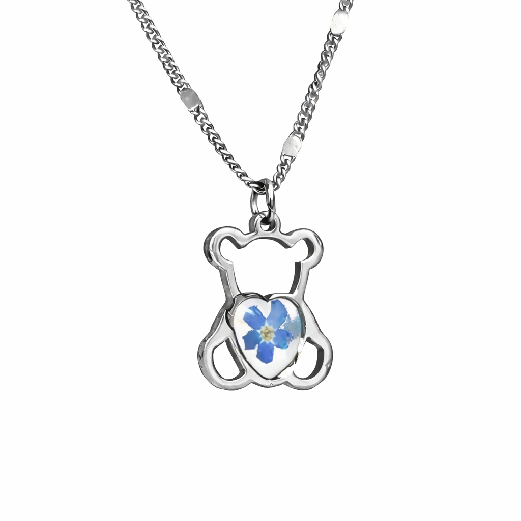 Ten uroczy naszyjnik w kształcie Misia 🐻 to kwintesencja delikatności i subtelnej elegancji. Wykonany z najwyższą starannością, naszyjnik ten zawiera prawdziwy kwiat niezapominajki zatopiony w przeźroczystej żywicy, co pozwala zachować jego naturalne piękno na wieczność..