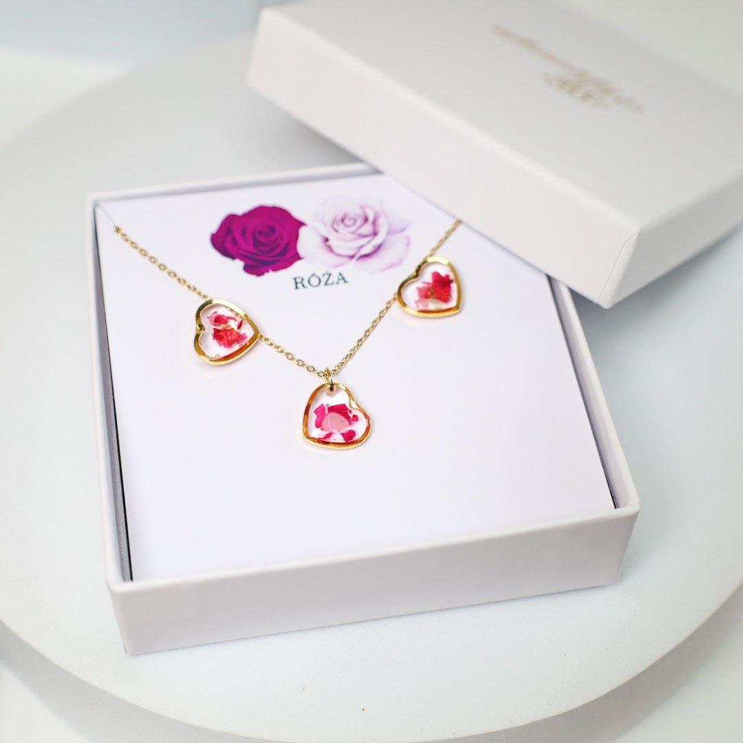 Delikatny zestaw z płatkami prawdziwej róży inspirowany naturą, który dodada subtelnego uroku każdej stylizacji. Nasz zestaw wykonany z wysokiej jakości materiałów przeniesie Cię bliżej natury i zapewni komfort noszenia.