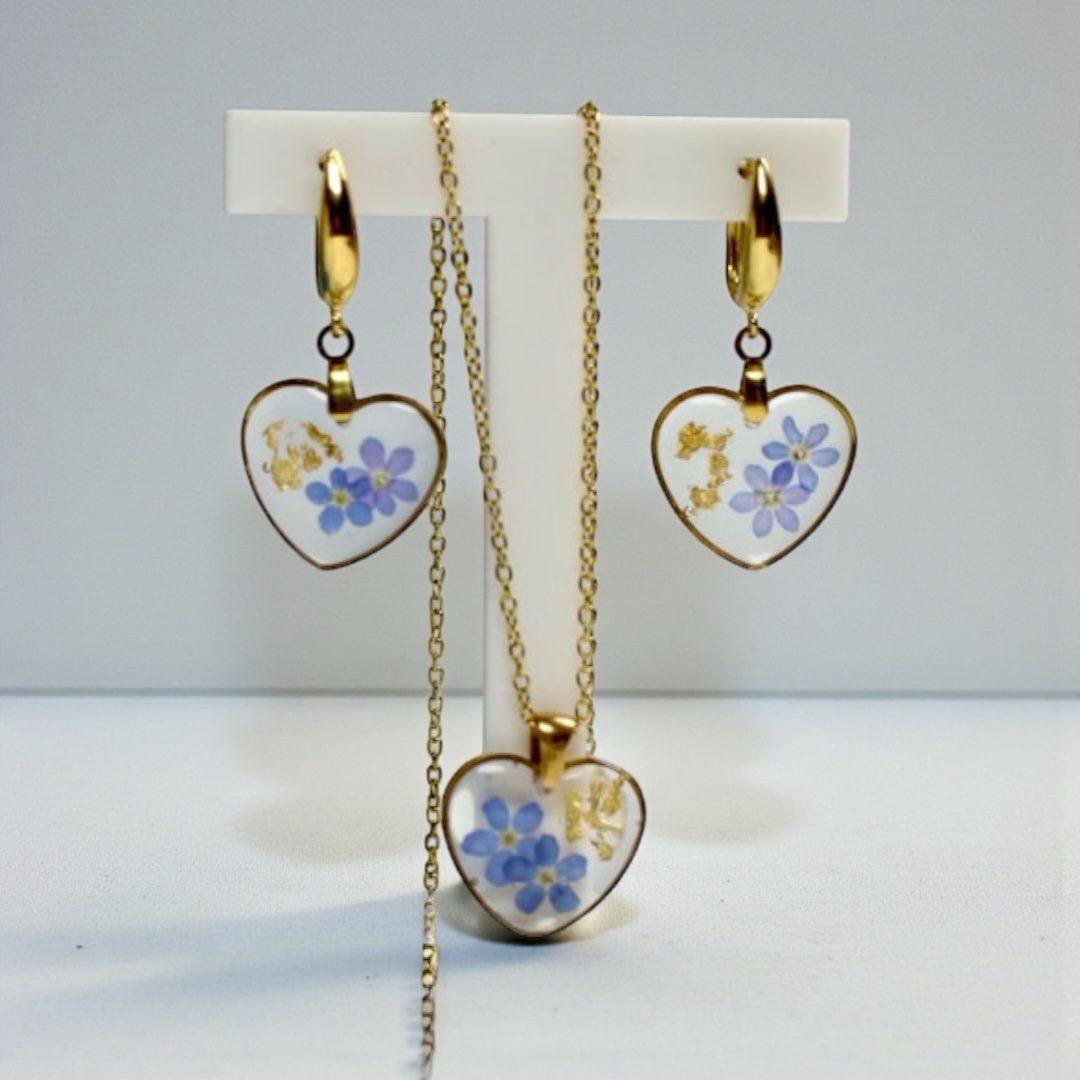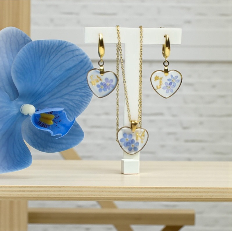 Przedstawiamy piękny zestaw: naszyjnik wykonany ze złotej stali nierdzewnej i żywicy jubilerskiej wraz z kolczykami. Delikatne serce z subtelnymi, niebieskimi kwiatuszkami Niezapominajkami, symbolizującymi miłość i szczęście. Niezapominajki są kwiatami, które kojarzone są z nieustającym uczuciem. Ten wyjątkowy zestaw łączy w sobie te emocje w jednym, niepowtarzalnym projekcie.