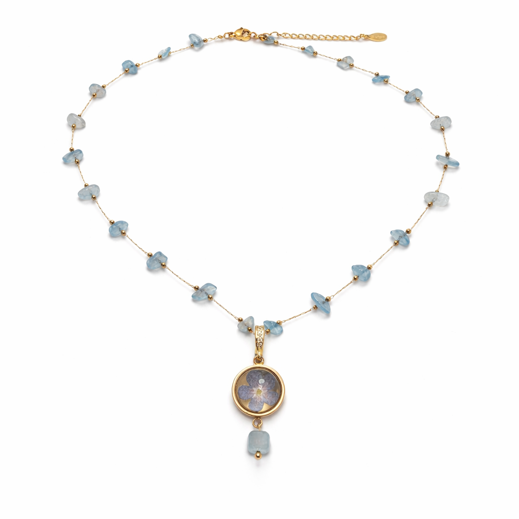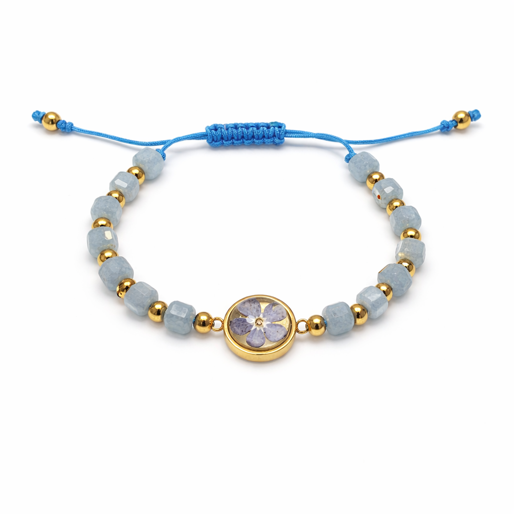 Delikatny zestaw z akwamarynem i prawdziwą niezapominajką to połączenie subtelnego piękna natury i wyjątkowej symboliki. Akwamaryn od dawna uznawany jest za kamień odwagi, spokoju i wewnętrznej harmonii — dodaje siły, pomaga zaufać sobie i iść przez życie z lekkością. Towarzyszy mu prawdziwa niezapominajka, która symbolizuje pamięć, bliskość i to, co najcenniejsze w sercu.