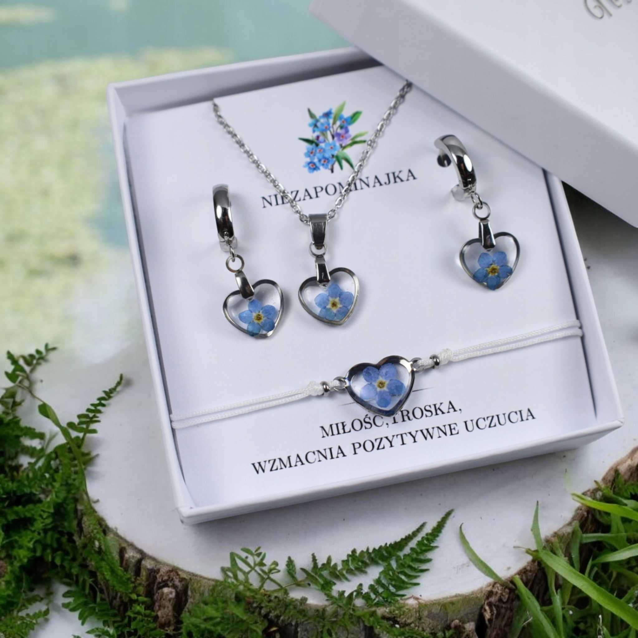 Zestaw prezentowy z niezapominajkami to wyjątkowa biżuteria z prawdziwymi kwiatami, stworzona z myślą o kobietach, które cenią delikatność, romantyczny styl i dodatki z znaczeniem. W komplecie znajduje się naszyjnik, kolczyki oraz bransoletka z serduszkowymi elementami i zatopionymi niezapominajkami.